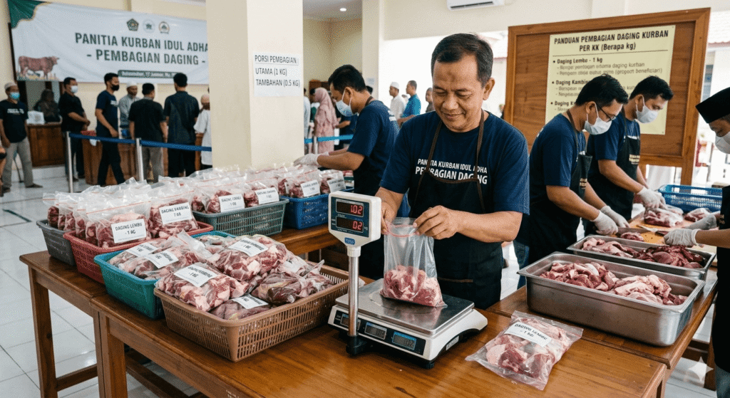 Panitia wajib menggunakan timbangan yang akurat. Ketimpangan berat yang mencolok antar kantong dapat menimbulkan kecemburuan sosial. Pastikan setiap kantong berisi campuran yang adil antara daging merah, sedikit lemak, dan tulang.